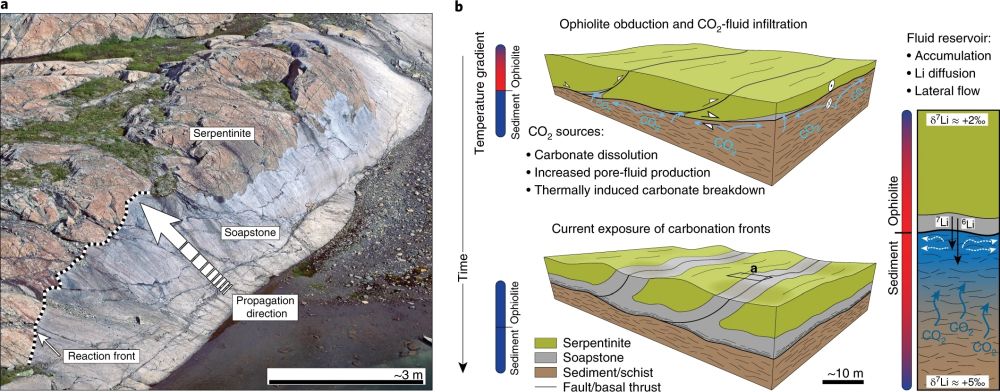 图1 蛇绿岩的逆冲和蚀变。 a.蛇纹岩裂缝边缘约3 m宽的滑石蚀变露头;b.蚀变过程示意图,蛇绿岩与下覆片岩之间普遍存在的碳酸盐岩接触带表明了蚀变流体的起源于沉积物压实而释放出的含碳流体。沿蛇纹岩内的裂缝(长度为十到几百米,并与逆冲基底相连)断层泥中也存在滑石,表明裂缝起了流体导通作用(Beinlich et al., 2020)