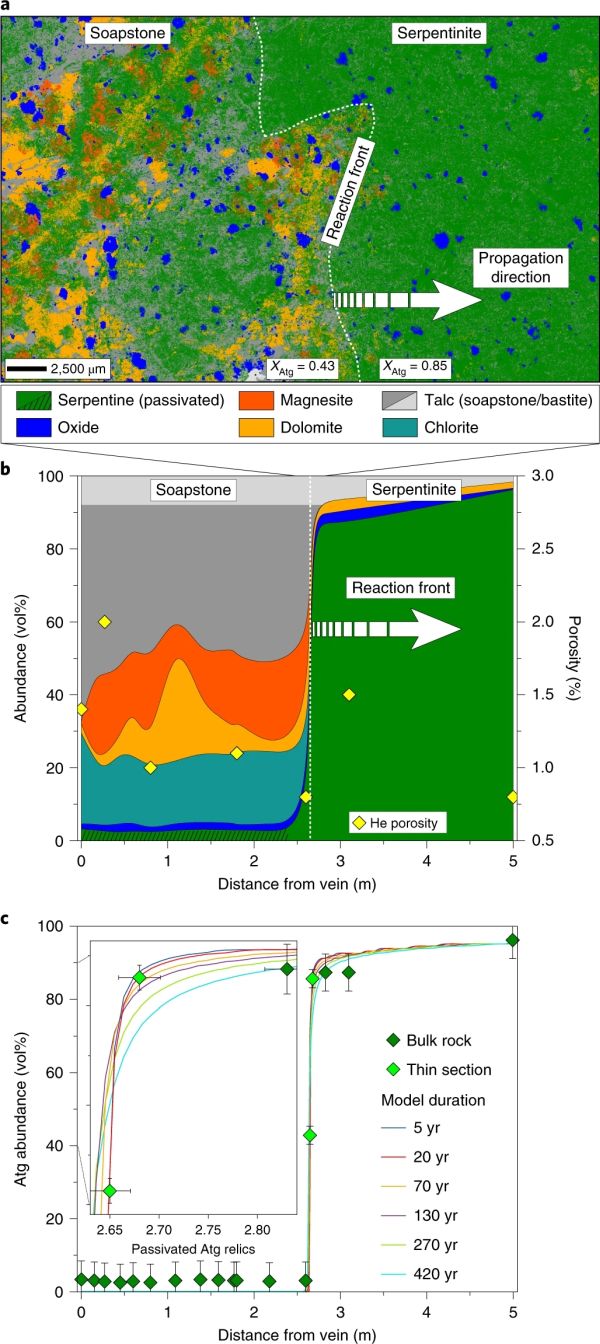 该研究结果表明,流体蚀变锋面扩展速度至少与大规模构造过程速度(如洋中脊扩张、板块运动和俯冲)相当(Stern, 2012)。因此,从地球动力学的角度来看,流体作用引发的岩石及其物性的变化可以快速进行。而这种快速的岩石转变过程,会引起介质渗透率的增加,从而促进了地壳中低渗透率岩石的流体导通能力。作者得到主要结论认为当存在反应性流体时,大陆碰撞和俯冲带中的大规模流体引起的岩石矿物转变可快速发生(数十年的时间尺度上)。因此从地质学角度推断,自然状态下碳封存、矿床形成以及地壳的岩石物理变化可以快速发生。