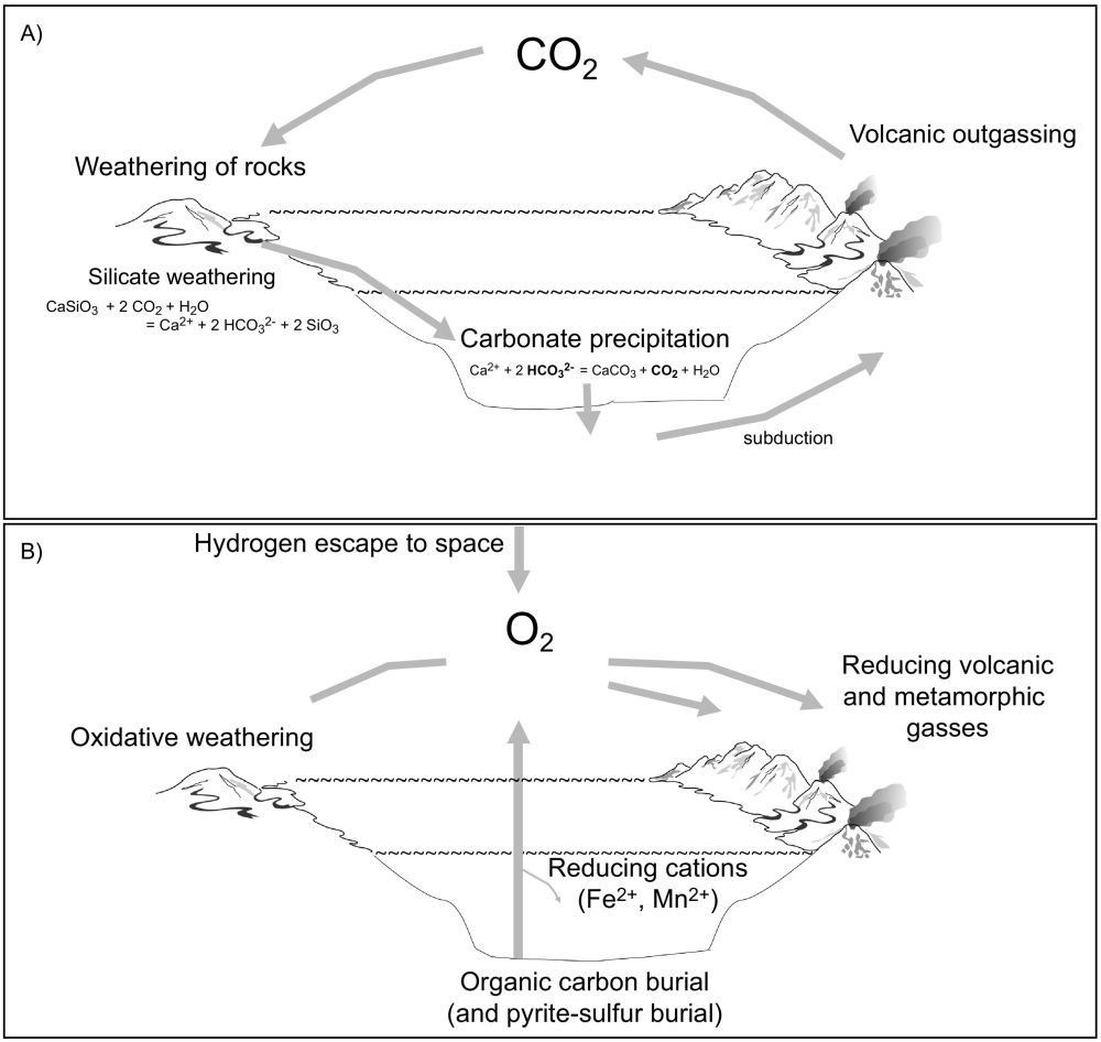 图3 地球地质历史时期大气CO2和O2的源汇及循环简图 (Dahl and Arens, 2020)