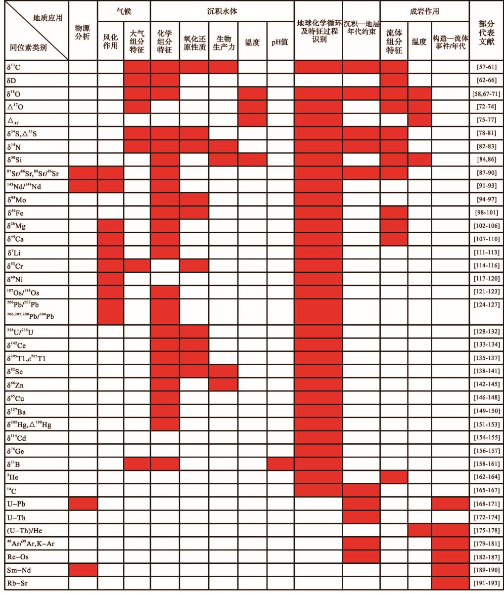 图5 同位素地球化学指标在古气候、古环境和古海洋等方面的部分应用情况。其中沉积水体化学特征及地球化学循环过程与气候存在直接或间接联系,一定条件下可用于约束古大气(周锡强等,2017)