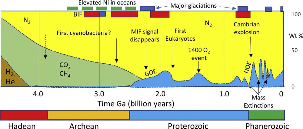 太古宙时期(约40–25亿年前),随着大陆地壳显著增生、大气氢气逃逸、产甲烷及产氧光合作用生物演化等重大地质事件,地球大气N2含量类似或显著低于现今水平,CO2和CH4含量相对较高