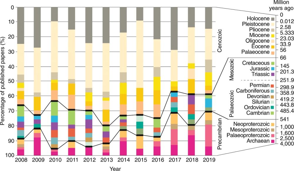 图8 学术期刊Nature Geoscience在2008–2019年期间,古气候相关论文所研究的地质时代分布特征。该期刊年均发表相关论文数量约为40–50篇,所研究的地质时代分布广泛,以新生代为主(其中全新世和更新世占主体),中生代和古生代次之,前寒武纪占比逐渐攀升(引自Nature Geoscience评论文章)