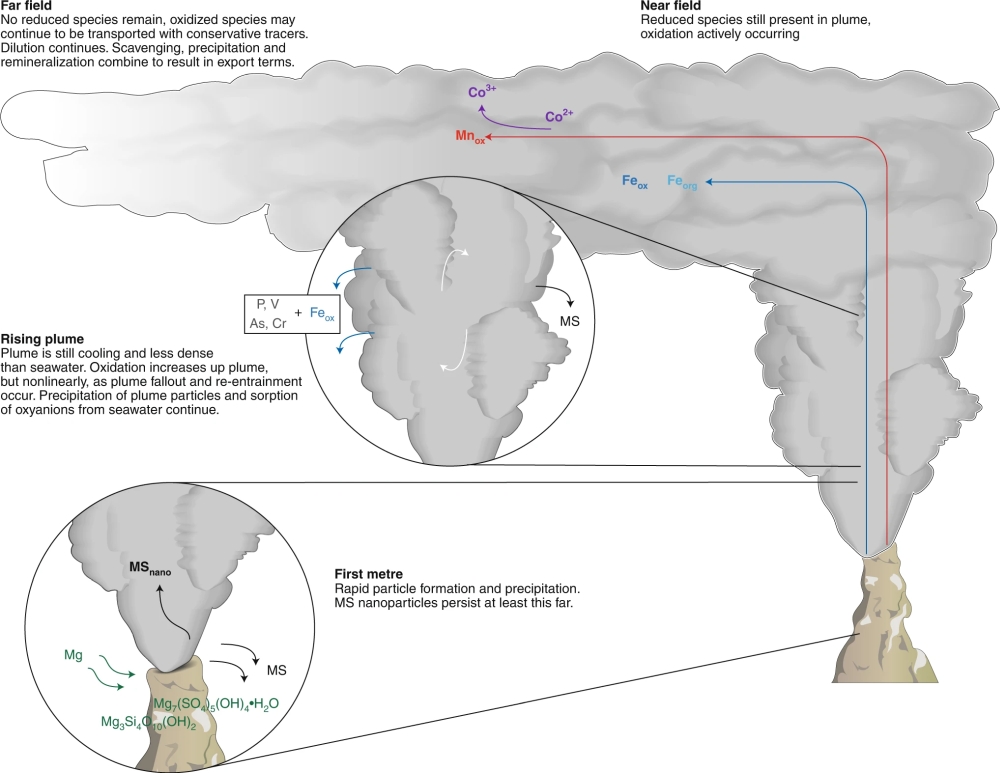 图1 热液柱特征。在热液柱形成和上升的初期,同位素数据和地质观察显示此时会发生金属硫化物(MS)的快速沉淀,其速度和规模受控于热液金属离子与硫的浓度。热液体系中,Fe相比于Mn更易与硫结合形成硫化物,而那些不与硫结合的金属离子通常或会发生氧化,或与有机质络合。金属硫化物在热液柱上升过程可发生氧化,也可被有机质絮状物吸收。通常,热液柱中发生的氧化作用持续时间较长,即使在热液柱停止上升时,也可在热液喷口附近继续发生。在热液柱扩散到最远端时,热液中所有的还原组分均会被氧化,此时海洋作用会取代热液作用,即热液贡献骤减。MSnano—金属硫化物纳米颗粒;Feox—铁氧化物;Mnox—锰氧化物;Feorg—有机质络合的铁(Gartman and Findlay, 2020)