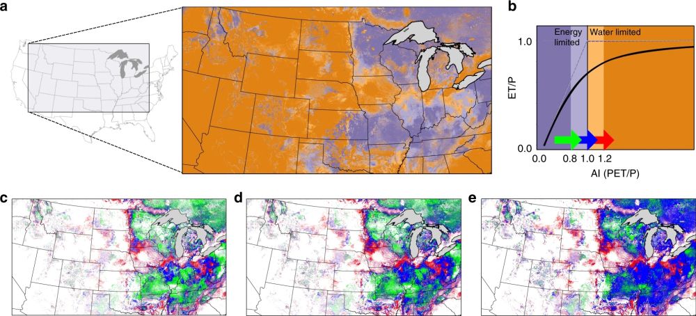 图1 气候变暖导致的干旱程度增加以及蒸散发量受水分和能量限制的变化情况。a.干旱程度分布图;b.干旱指数与蒸发系数关系图(Condon et al., 2020)