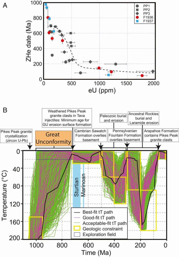 Flowers et al.(2020)对派克峰花岗岩内30颗锆石进行了(U-Th)/He热年代学分析,旨在进一步精确限定岩基的初始暴露时间。原理很简单:岩体侵位、剥蚀、暴露到地表时会冷却,因此锆石ZHe数据能够记录这段关键时期的冷却历史。锆石数据显示了ZHe和U含量(eU)之间呈现负相关关系(图2A)。年龄分布在975±41 Ma~46±1 Ma之间,eU分布在37-1955 ppm之间。这种分布型式指示放射损伤剂量越高,He保留的就越少。Flowers et al.(2020)应用HeFTy程序和锆石放射损伤积累和愈合模型(ZRDAAM)对派克峰花岗岩锆石的ZHe数据进行了时间-温度模拟,以此来检验锆石ZHe数据是否和717 Ma之前基底剥蚀的地质证据相吻合(图2B)。拟合最佳的时间-温度轨迹再现了所观测到的ZHe-eU分布规律。更重要的是,这套可行的时间-温度路径允许浅部花岗岩岩基在1000-717 Ma之间侵位、冷却和剥蚀暴露到地表。该研究说明这些大型不整合面之下的侵蚀作用发生在成冰纪冰川之前,和冰川作用无关,更可能是由于区域上多期、穿时的构造侵蚀作用形成的。