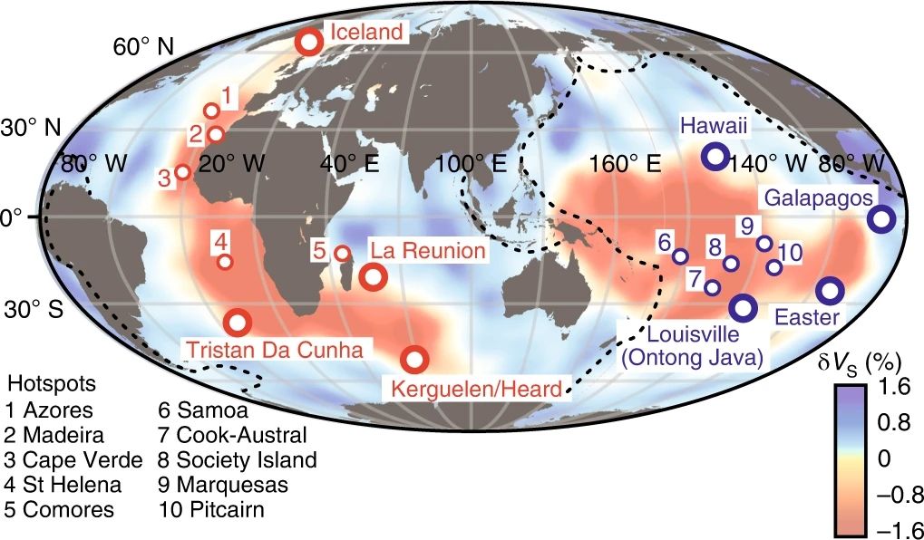 Courtillot V, Davaille A, Besse J, et al. Three distinct types of hotspots in the Earth’s mantle[J]. Earth and Planetary Science Letters, 2003, 205(3-4): 295-308. (Link)