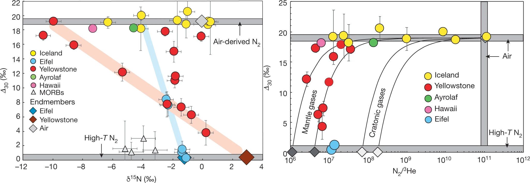 该研究认为,地热区的气体或幔源气体的δ15N比值很可能是氮气来源的“伪示踪剂”,利用Δ30这一新的同位素体系可以有效消除样品空气混染的干扰,从而提取其中所蕴含的深部信息。因此,对于前人基于地热、温泉等气体样品δ15N比值所进行的研究及其获得的结论,例如地球内外部储库的建立、物质循环过程示踪等,可能需要重新审视和评估。