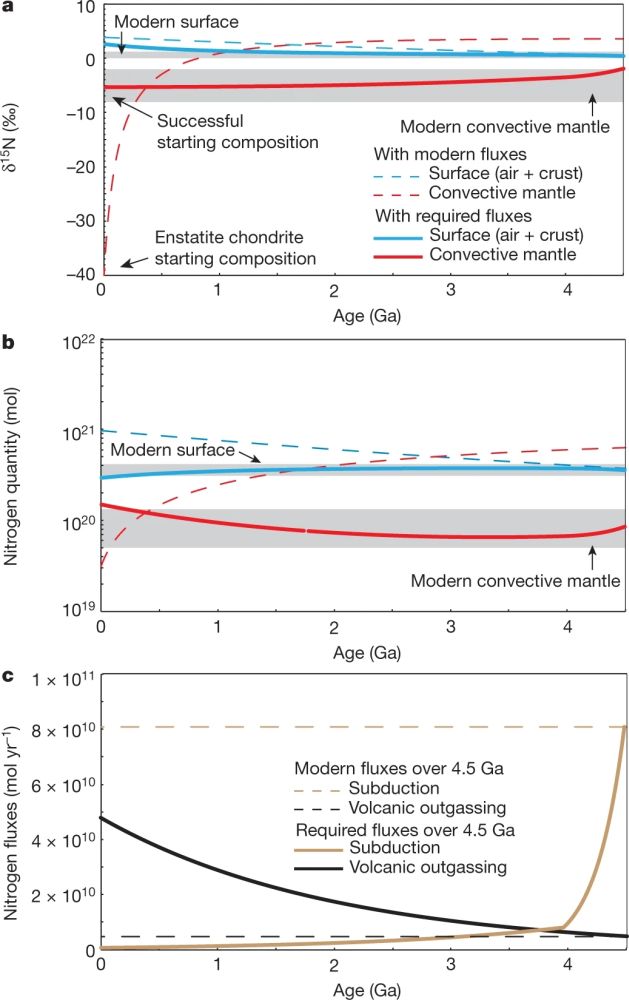 此外,作者还开发模型进一步探索地幔及地表氮在地质历史时期的演化关系(图2)。结果表明,在大部分时间里,对流地幔一直存在氮的净损失,俯冲作用对深部氮循环的影响可能远被高估。考虑到地表氮在地幔中的作用有限,作者认为,对流地幔和地幔柱较重的δ15N比值可能主要反映了地球形成和早期分化过程中保留的原始特征。模型获得的另一个重要结论是,如果以现今地球排气和俯冲速率进行计算,δ15N比值最终会演化到一种稳态,并且地幔的δ15N比值要比地表更高 (图2a虚线),这与真实情况是相反的。