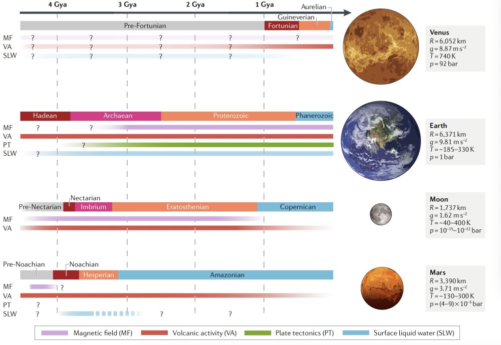 地球的历史有几个重要时间节点,包括地核的形成;发电机的产生;早期大气层的产生;板块运动的开始;生命的出现。太阳系其他行星可以作为地球不同时期星球环境的参照物。由于持续进行的板块运动,地球早期的演化历史在地表的痕迹都被抹除了,迫使人们把目光转移至其他行星。以下4个科学问题可以通过类比早期地球和其他行星来进行研究。