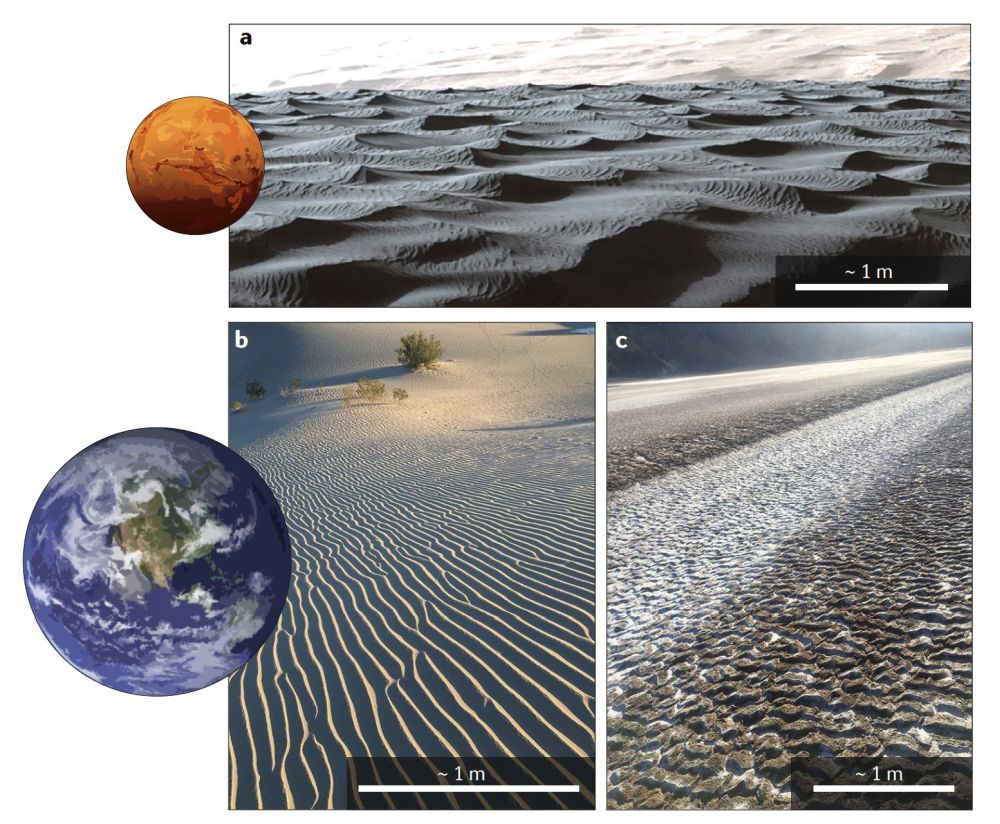 底形(Bedforms)构造如涟漪或沙丘,是当流体经过颗粒状地表时产生的地貌形态。例如水流经沙子或砾石,风流经沙子,会产生波纹状的独特地貌。由于底形构造与环境息息相关并可以得到保存,一直是地球古环境研究的重要指标。人们对地球底形构造的理解基于地球地表的观测,但这种理解在其他行星的观测中受到了挑战。如图3所示,火星米级风成沙丘很常见,但在地球却罕有观测。对这些沙丘构造的认识不仅为现有的地球沙丘成因机制带来了考验,也促使我们对地球河床及风沙底形构造有了新的理解,对地球环境及沉积记录有重要的应用价值。