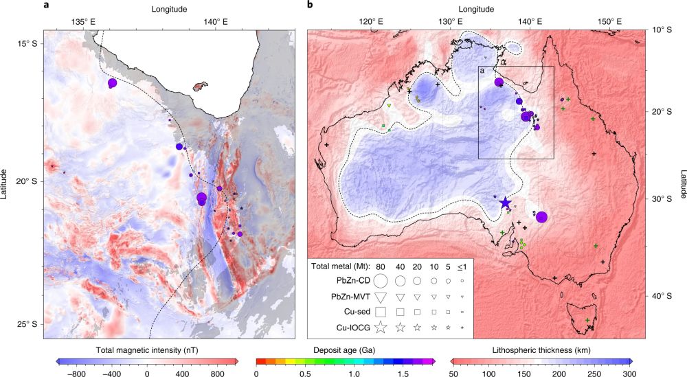 Hoggard et al. (2020)的研究揭示了大型沉积岩容矿贱金属矿床与稳定的厚岩石圈边缘之间的紧密联系。世界上约55%的铅、45%的锌和20%的铜都在分布在该边缘两侧约200km范围内。这一成果可以用于寻找沉积岩容矿贱金属矿床,仅根据岩石圈厚度标准,全球寻找新矿床的搜索空间就可减少三分之二。