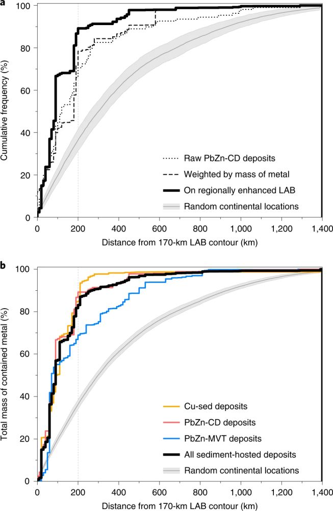 为了量化这种视觉关系,Hoggard et al. (2020)计算出每个矿床与170 km LAB厚度等值线之间的最短距离,并将结果绘制在累积分布函数(CDF)中(图3)。结果显示,在全球范围内约95%的Cu-sed、约90%的PbZn-CD和约70%的PbZn-MVT资源位于170 km LAB厚度等值线两侧的200 km范围内(图3b)。