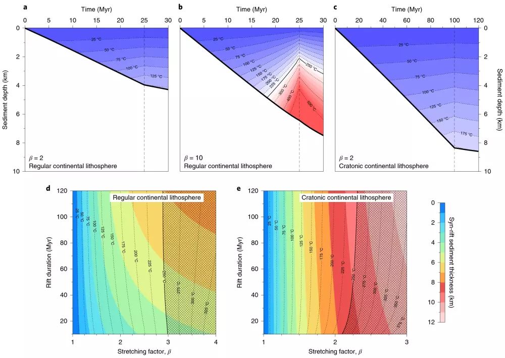 图4 盆地沉降历史热模拟。a.普通大陆岩石圈内同裂谷沉积,β=2;b.普通大陆岩石圈内同裂谷沉积,β=10;c.克拉通大陆岩石圈内同裂谷沉积,β=2;d.普通大陆岩石圈裂谷作用控制下的成矿系统,颜色代表沉积物厚度,阴影区代表温度过高不沉淀金属矿物;e.克拉通大陆岩石圈裂谷作用控制下的成矿系统(Hoggard et al., 2020)