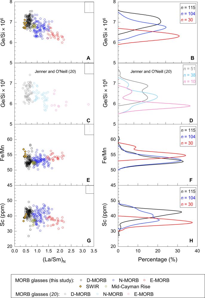 Yang S, Humayun M, Salters V J M. Elemental constraints on the amount of recycled crust in the generation of mid-oceanic ridge basalts (MORBs)[J]. Science Advances, 2020, 6(26): eaba2923.(链接)