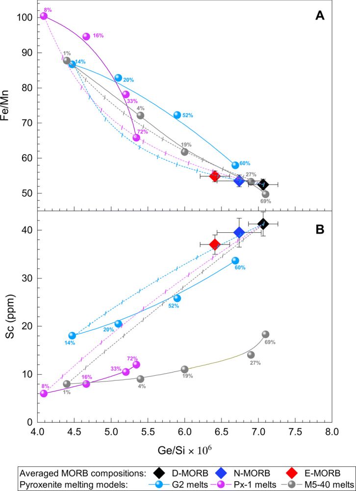 图2 部分熔融模型及混合模型显示在平均亏损洋中脊玄武岩(D-MORB)组分中混入具有低Ge/Si比值和Sc含量以及高Fe/Mn比值的辉石岩熔体,可以得到正常(N-MORB)及富集洋中脊玄武岩(E-MORB)(Yang et al., 2020)