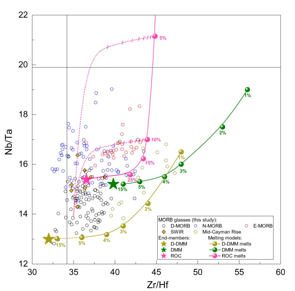 洋中脊是绵延于大洋底的长达八万公里的火山山脉。地幔的热对流在洋中脊处上升,快速冷却为洋中脊玄武岩(MORBs),形成新的大洋地壳。作为板块运动的一部分,随着洋中脊的扩张,在洋中脊形成的大洋地壳在接近俯冲板块边界的过程中逐渐变冷变重,最终俯冲进入地幔,形成一个大洋地壳的循环。俯冲的大洋地壳在进入地幔之后的命运如何呢?这是一个重要的科学问题。一个经典的地幔模型把这种混入俯冲物质的地幔比喻成大理石蛋糕(Marble-cake) (Allègre and Turcotte, 1986),俯冲的洋壳就像缓慢倒入蛋糕糊中的巧克力,而地幔就像是内部不均匀得分布着巧克力的蛋糕。这些“巧克力”的一部分可能会随着地幔对流上升,在洋中脊处重新熔融,进入到新生的大洋地壳中。长期以来,地质学家们都在尝试用各种手段示踪地幔里的“巧克力”,揭示地幔的不均一性。根据稀土元素的富集程度差异,洋中脊玄武岩被划分为了富集(enriched-MORB),正常(normal-MORB)和亏损(depleted-MORB)三种类型。然而,洋中脊玄武岩化学组分上的变化所反映出来的地幔不均一性究竟是由地幔化学成分的不均一性导致的,还是由地幔岩性的不均一性导致的呢?这一问题还存在着较大的争论(e.g, Hirschmann and Stolper, 1996; Donnelly et al., 2004)。