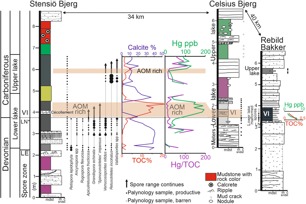 研究人员对东格陵兰地区记录了泥盆纪-石炭纪界线灭绝事件的多个湖相剖面(Stensio Bjerg、