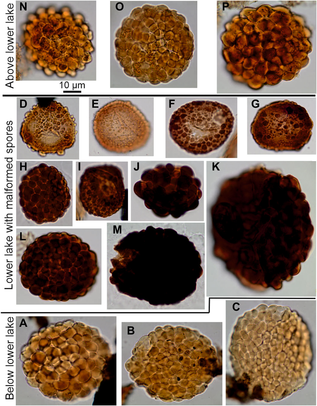 图3 泥盆纪-石炭纪界线及其上、下层位正常及畸形V. nitidus 孢子。(A–C)Stensio Bjerg剖面D-C界线之下充满瘤的正常V. nitidus 孢子。(D–K)Rebild Bakker剖面lower lake层位V. nitidus 孢子。(H–M)色素沉淀增强且瘤体直径增大的V. nitidus 孢子。(D–G)个体小色浅且瘤体不规则V. nitidus孢子。(N–P)Rebild Bakker剖面upper lake层位正常V. nitidus孢子。(Marshall et al., 2020)