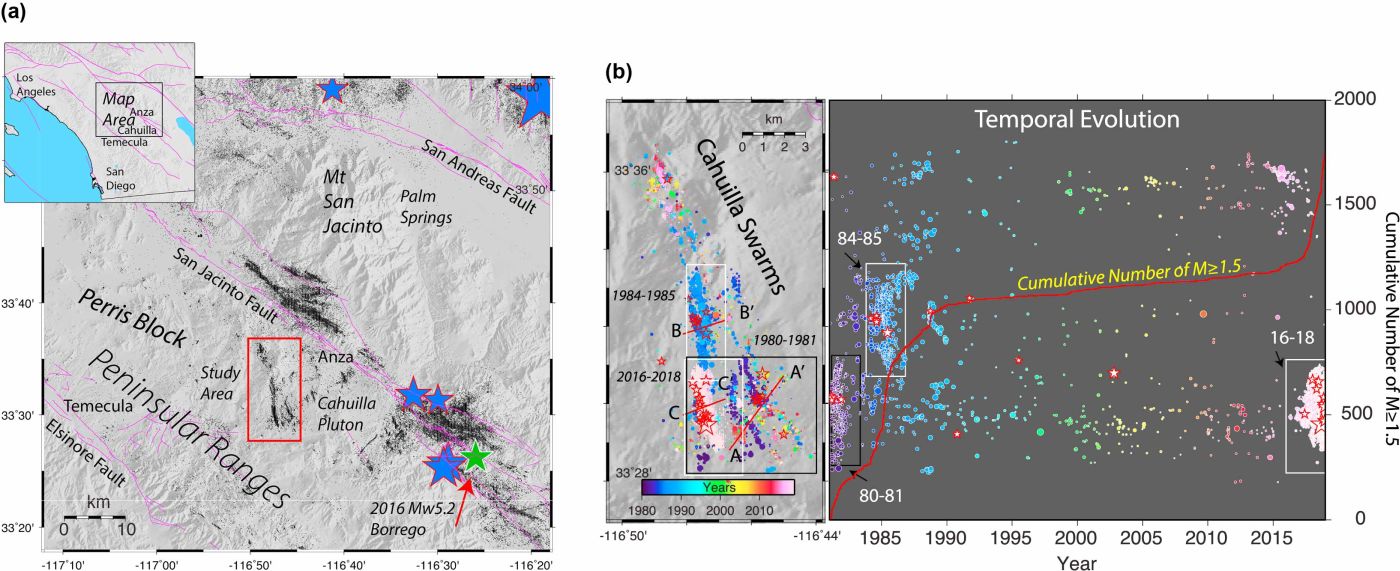 Hauksson E, Ross Z E, Cochran E. Slow‐growing and extended‐duration seismicity swarms: Reactivating joints or foliations in the Cahuilla Valley pluton, central Peninsular Ranges, Southern California[J]. Journal of Geophysical Research: Solid Earth, 2019, 124(4): 3933-3949.(链接)