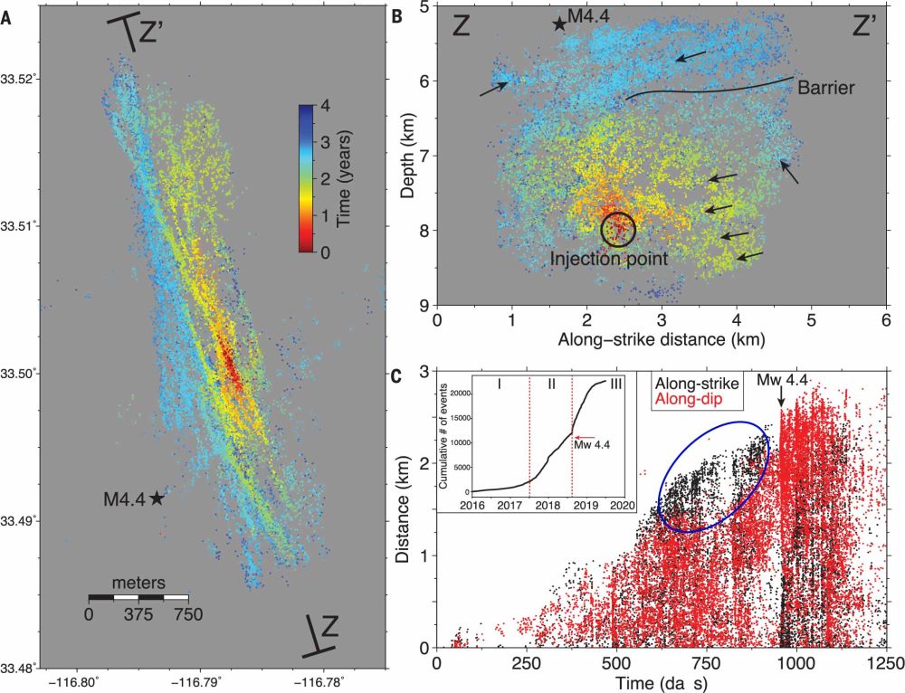 (3)地震序列的空间演化过程为推测断层带的物性特征提供了直接证据。这个震群的非均匀空间分布暗示断层带的渗透性体系是空间变化的。在4年的震群活动期内,只存在极少量震源深度大于8.5 km的地震,因此推测在该深度可能存在一个渗透率障碍体,或者断层带自身没有延伸到更深或者在这个深度存在介质流变性的变化。2016-2017年,震群在断层面内的迁移速度基本是各向同性的。此后,沿走向的迁移相对沿倾向的迁移速度更快,这同流体进入断层通道的推测相一致(图2c)。在2018年8月,在震群开始3年后,在大约6 km深度处沿断层带倾向向上的迁移基本停止了,仅在断层区东南端沿走向约1 km长的区域内地震继续向上迁移;而在这些地震向上迁移500 m后,地震活动快速升级并最终形成序列中最大的地震(Mw4.4地震)。此后,震群基本是向西北方单向迁移,将深度小于6 km的地震空区填满。基于这些观测,作者推测在6 km深度存在一个近水平的渗透性障碍体,几乎没有流体可以穿过它。因此,断层区的渗透性结构对局部的扩散性质起控制作用,渗透率不是静止不变的标量,而是一个随空间和时间变化的张量,渗透率可能会伴随滑移和断层恢复过程而随时间变化。