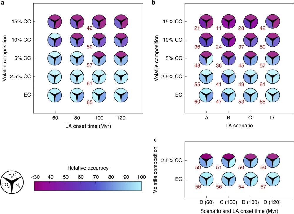 Gillmann et al.(2020)将撞击模型与行星内部-大气耦合模式相结合,模拟了在岩浆洋固化后的挥发物演化(图1),通过对比不同的后期增生模型,将模拟结果与现今金星大气对比,获得了最佳的后期增生模型(图2)。金星早期的增生性碰撞和大气导致高温,形成岩浆洋。此阶段原始大气会在千万年尺度就逃逸掉,每十万到千万年间陆地水将流失一次,岩浆洋在百万年间迅速固化。因此,在岩浆洋固体化后,也就是演化模型开始时,金星大气的初始水含量为零;岩浆洋会释放二氧化碳,氮气主要被束缚在表面,所以后期增生阶段开始时的挥发物压强设定为(0 bar N2,0 bar H2O,65 bar CO2)。在后期增生阶段,尽管有大气逃逸和撞击侵蚀,但并不足以防止挥发物的积聚,火山脱气和由撞击熔融引起的去气也只是一个二阶效应。水被认为主要来自碳质球粒陨石,N2和CO2主要来自碳质球粒陨石和顽辉石球粒陨石。后期增生结束之后,大气含水量就完全由大气逃逸和火山去气决定,它们也会导致金星大气中氮气和二氧化碳的缓慢富集(见图1)。