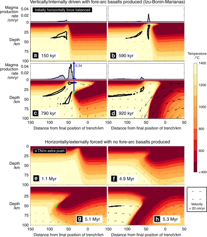 作者设计的初始模型为一个年龄为50 Ma 的太平洋板块与一个年龄为5 Ma的菲律宾板块水平相接,二者之间由一个宽为10 km的薄弱带(转换断层)相连(图1b)。这样的初始设计使得年轻的菲律宾板块自发向东推挤古老的太平洋板块,该内部推力的大小约为2 TN/m。为了让模型开始运行时水平方向的力保持平衡,作者在太平洋板块的远端施加了一个向西的外部力。在内部垂向力主导(净水平推力为0)的模型中(图2a-图2d),作者发现仅需一个小的垂向拉力(由局部密度异常产生,大小约为9 TN/m,远小于典型俯冲板块向下的拖拽力~30 TN/m)就能导致俯冲快速起始,最终形成末端向下的完整俯冲。在此过程中,太平洋板块下沉进入地幔,在转换断层的下方形成了一个岩石圈“间隙”,软流圈由此上涌发生减压熔融,形成弧前玄武岩(图2a、图2b)。随着太平洋板块的不断下沉,俯冲洋壳的前端越过固相线开始熔融并发生脱水,流体上升使得上方亏损的地幔发生水化熔融,形成玻安岩(图2c)。作者发现在此机制下弧前玄武岩与玻安岩初始喷发的时间间隔相差仅0.6 Myr(图3),与钻探取芯的数据近乎一致。随着俯冲起始的进一步发展,俯冲板片开始沿着自身长度持续俯冲,软流圈物质停止流向弧前下方的间隙,减压熔融流向未来的弧后地区,形成一个地幔楔(图2d)。新板片水化地幔楔,岛弧上将出现典型的钙碱性岩浆作用。在外部水平推力主导的模型中(图2e-h),没有形成初始阶段的岩石圈“间隙”,也没有软流圈的上涌和减压熔融发生,因此没有形成弧前玄武岩,并且此条件下俯冲起始的时间较长,约5 Myr。这种俯冲起始可能发生在新西兰南部的普伊斯哥海岭或西南太平洋的马修-亨特俯冲带。