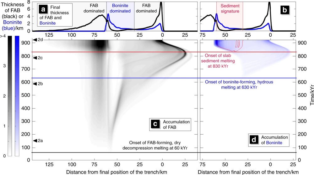 为了解释IBM弧前玄武岩-玻安岩序列的形成机制,最近,英国帝国理工学院的B. Maunder及合作者开展系统的二维动力学数值模拟实验,通过对比分别由板块内部垂向作用力(板块自身重力)和远场水平推力主导的俯冲起始,发现前者能很好的解释IBM弧前和弧后岩浆序列的时空分布,而后者则无法形成弧前玄武岩。据此,他们提出IBM俯冲起始及岩浆活动是由板块内部的垂向力(由局部密度异常引起)而非远场水平挤压力导致,相关成果发表于Nature Communications。