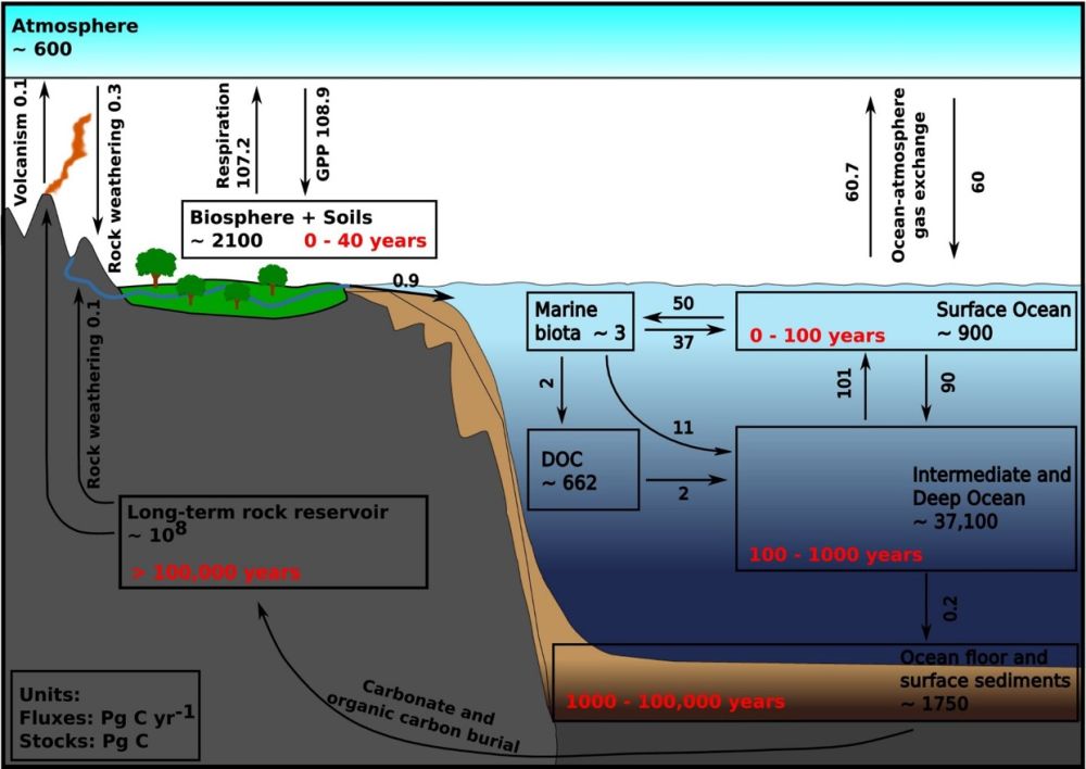 图1 全球碳循环简图 (Hülse et al., 2017)。黑色图框示意地球系统各类碳储库,其内部黑色数字表示前工业化时代的碳储量(Pg C),红色数字表示各储库对大气CO2浓度施加控制作用的时间尺度。黑色箭头表示储库间的碳转移路径及通量