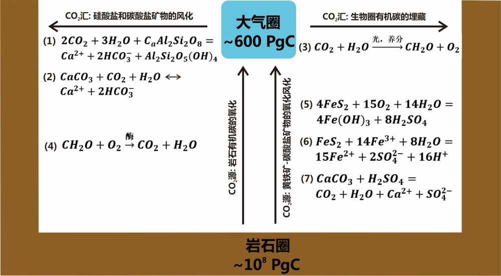 图2 大气圈、岩石圈和生物圈之间碳循环相关的化学反应。CO2汇:(1)硅酸盐矿物的风化;(2)碳酸盐矿物的风化;(3)生物圈有机碳的埋藏。CO2源:(4)岩石有机碳的氧化;(5-7)黄铁矿-碳酸盐矿物的氧化风化(Torres et al., 2014)