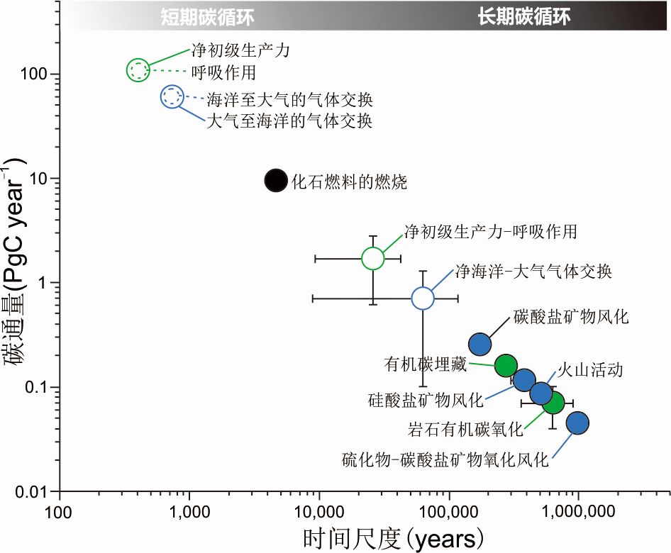 图3 全球碳循环的碳通量与时间尺度的关系 (修改自Hilton and West, 2020)。绿色表示有机碳循环,蓝色表示无机碳循环。空心圆圈代表小于10万年的短期碳循环,包括净初级生产力、呼吸作用和海气交换。实心圆圈代表大于10万年的长期碳循环