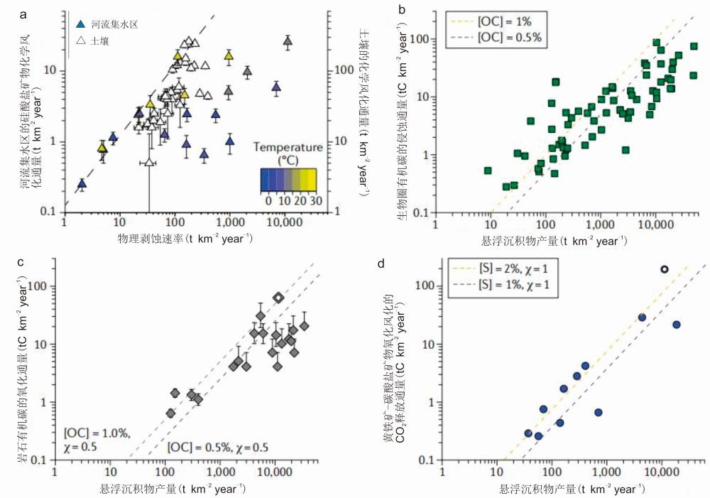 图5 河流集水区的物理侵蚀速率与碳转移关系图解 (修改自Hilton and West, 2020)。(a)物理剥蚀速率与硅酸盐风化通量的关系。(b、c、d)全球不同河流悬浮沉积物产量分别与生物圈有机碳的侵蚀通量、岩石有机碳氧化通量、硫化物-碳酸盐矿物氧化风化的CO2释放通量的关系