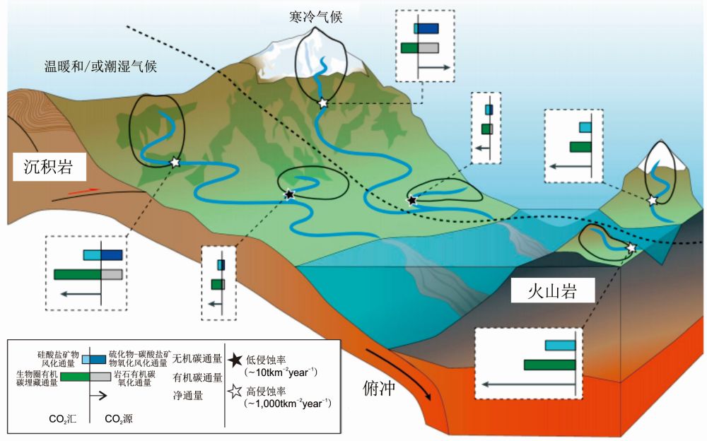 图6 山脉、侵蚀作用和碳循环的新认识 (修改自Hilton and West, 2020)。白色和黑色五角星分别代表高侵蚀速率和低侵蚀速率的集水区。沉积岩为主的河流集水区位于左侧,火山岩为主则位于右侧。虚线两侧分别对应温暖潮湿和寒冷气候。碳通量源自现有数据的定性示意