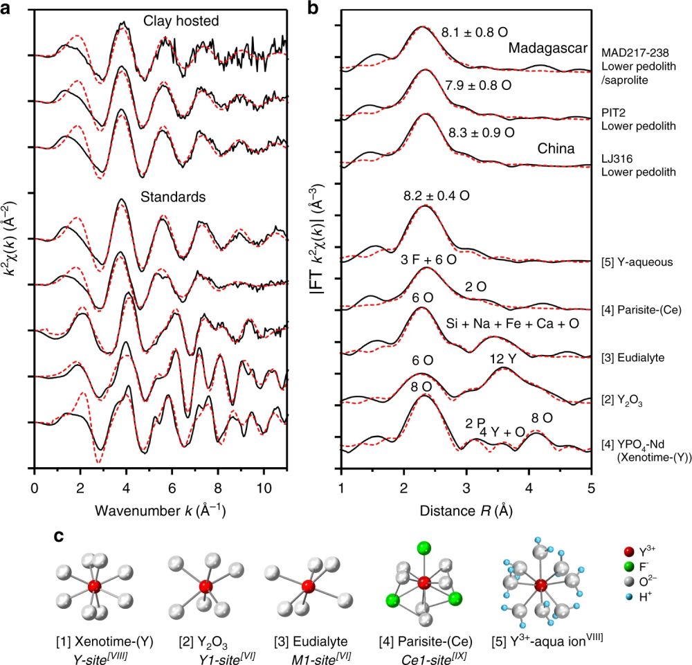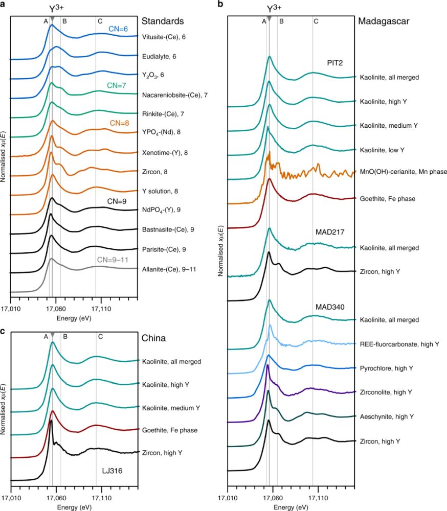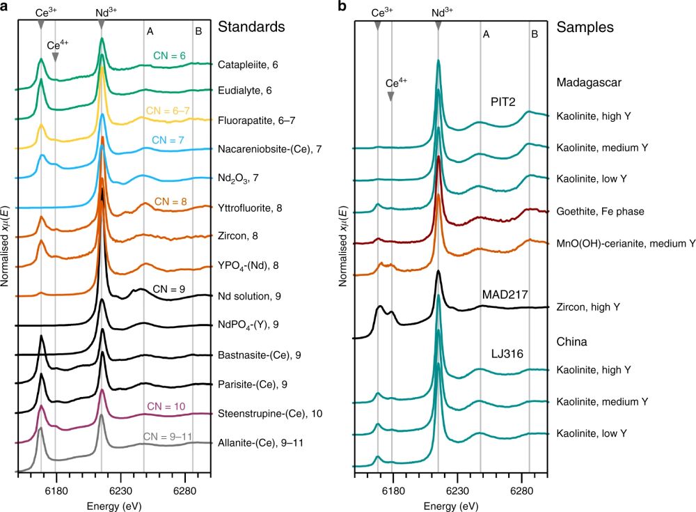 传统观念认为,稀土元素在风化壳型稀土矿床中主要以离子吸附形式赋存在粘土矿物中,这很大程度上是由于稀土能透过化学交换直接从这类矿床中提取出来。然而,上述稀土元素的赋存状态尚没有明确的证据支持。此外,不同矿床中粘土矿物的结构是否具有可比性,稀土元素在不同矿床中的赋存形式是否存在差异仍不明确。为了解决这些问题,Borst et al.(2020)利用同步辐射X射线吸收光谱(包括X射线吸收近边结构XANES、扩展X射线吸收精细结构EXAFS及微同步辐射X射线荧光元素扫面μSXRF)对比研究了江西寨背花岗岩风化剖面和马达加斯加北部Ambohimirahavavy碱性杂岩体风化剖面中Y和Nd(分别代表重稀土和轻稀土)的分布状态及局部成键环境。结果表明,稀土元素以易浸出的8-9配位水合配合物的形式吸附于高岭石上。