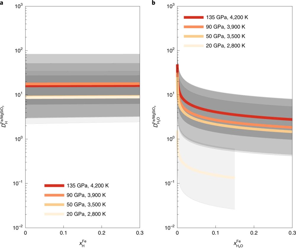 图1 不同温压条件下H (a)和H2O (b)在铁和硅酸盐熔体之间的分配系数,横坐标是H (a)和H2O (b)在铁中的摩尔浓度,阴影区域代表不确定度