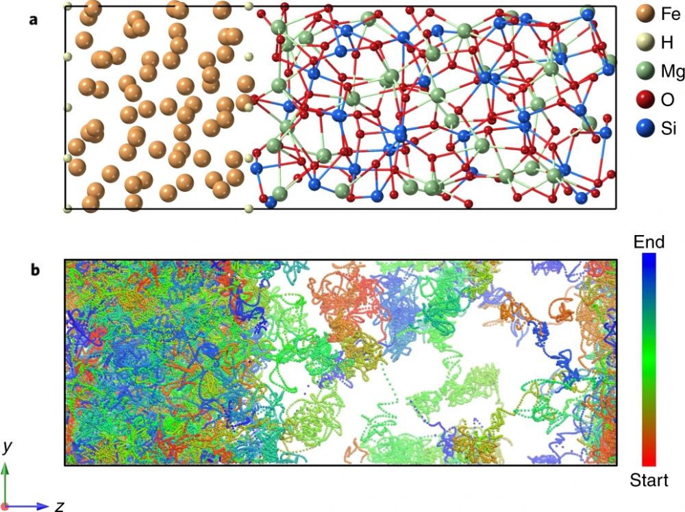 图2 经验计数法估算H的分配系数。(a)第一性原理分析动力学模拟的初始构型,12个H原子分布在64个铁原子(左)和32个MgSiO3分子(右)的界面处,模拟过程中铁和硅酸盐都是熔体状态;(b)模拟过程中12个氢原子的运动轨迹