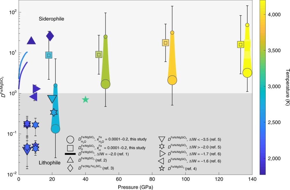 对于地核是否是氢/水的储库这一问题,其实仍然有争议和变数。除了氢元素,地核中还可能会有硅、硫、氧和碳等轻元素,这些轻元素之间也会相互影响。其实,该论文本身就报道了铁熔体中O和H都倾向于与Fe成键,O和H之间存在竞争关系;结合他们分配系数的结果来看,O会减弱H的亲铁性,也就是说地核中氧的含量会影响氢的分配系数。地核中其它轻元素(Si、S、C等),对H分配系数的影响和制约,目前的认识几乎还是空白,这将是未来更多高温高压实验与第一性原理模拟研究关注的重点。