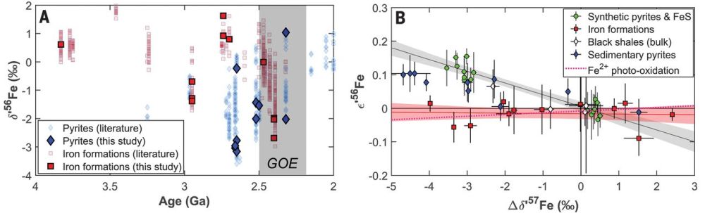 图1 GOE之前铁沉积物、实验室合成的黄铁矿和FeS的铁同位素系统。(A)早期沉积黄铁矿和铁建造的铁同位素(δ56Fe)特征;(B)铁建造、黄铁矿和黑色页岩的三铁同位素系统(ε'56Fe-Δδ'57Fe)。所报导天然样品和合成黄铁矿的Δδ'57Fe值是与各自起始物质的差值,相对于标准物质IRMM-014。红线和红色阴影区域代表与铁的氧化还原有关的质量分馏线,它们是通过分析同位素轻的、富锰的铁建造获得;黑线和黑色阴影区域表示黄铁矿化过程中的动力学分馏效应,是测定通入H2S在实验室沉淀黄铁矿来限定。质量分馏线意味Fe2+氧化发生,它是由Fe2+-Fe3+平衡控制。GOE之前的黄铁矿落在铁氧化和黄铁矿化两个端元的中间区域