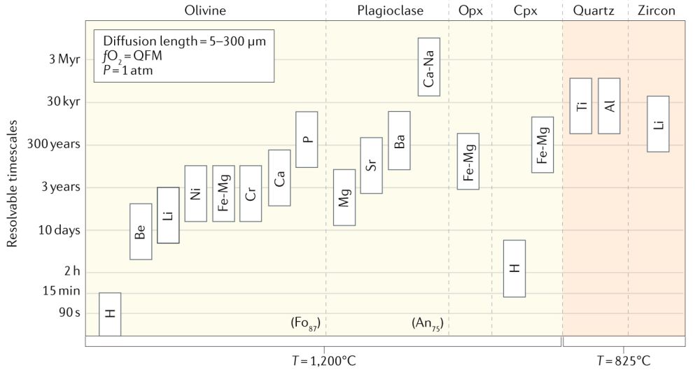 图1 特定条件下,不同元素在常见矿物中的扩散时间尺度分辨范围总结(Costa et al., 2020)。图示时间尺度的估算基于以下参数条件:对于赋存于玄武岩中的矿物(如橄榄石、斜长石、斜方辉石和单斜辉石)和流纹岩中的矿物(石英、锆石),分别取1200℃和825℃为例;假设扩散长度为5-300微米,氧逸度为QFM buffer,压力为1 个标准大气压