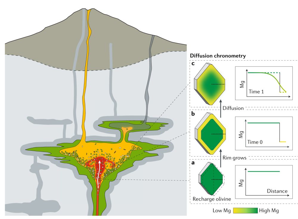 以火山下的玄武质岩浆系统为例。上涌岩浆将深部结晶的矿物(如橄榄石)带至浅部岩浆房;在岩浆化学分异和/或岩浆补给的作用下,浅部岩浆房中的岩浆的化学成分发生变化(如向低镁演化);新生长的橄榄石边缘继承这一组成变化,形成具不同元素组成的环带。在化学浓度梯度(化学势)的驱动下,元素在晶体内发生扩散,扩散计时器开始计时。随着岩浆持续分异以及来自深部岩浆的挥发分补给,岩浆中挥发份逐渐达到饱和,岩浆在浮力作用下向浅表运移,最终喷发。岩浆在喷发前快速上移及喷出地表的过程中会经历相对快速的降温,当温度足够低时,晶体中元素的浓度几乎不再变化,扩散计时器停止。通过测量火成岩晶体中元素浓度的空间分布,可以反推出在一定温度下元素在晶体中扩散所消耗的时间(图2)。