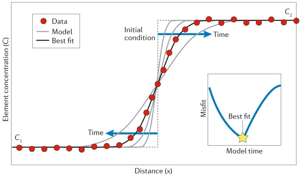 利用已知的扩散系数,以及设定的扩散的初始条件及边界条件,我们可以使用有限差分法对菲克第二定律求解。把有限差分模拟获得的经假定时长扩散后形成的浓度剖面,与自然晶体中测得的浓度剖面进行对比,便可以找出拟合程度最好的曲线,由此获得扩散时长。
