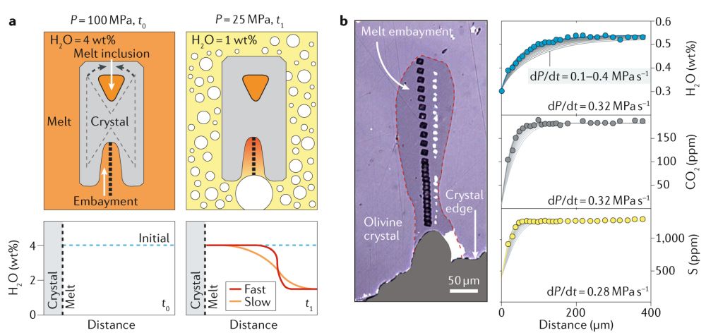 除了岩浆混合及滞留过程,扩散年代学还可以应用于探究喷发前岩浆从浅部岩浆房上升至地表这一更短过程的时限。由于浅部岩浆上升至地表这一过程通常仅耗费数小时到数天,探究这一过程的时长需要依靠扩散速度更快,且浓度会在岩浆上升(减压)作用下发生变化的元素或组分。目前已有的方法包括模拟矿物中熔体包裹体(melt inclusion)及半开放包裹体(melt embayment)中水的扩散 (图4),橄榄石及辉石中氢元素的扩散,以及长石及石英中的锂元素扩散,等等。此外,地幔捕掳体中橄榄石及辉石中的氢元素扩散,还被用于推测地幔岩浆快速上升至地表的时长。