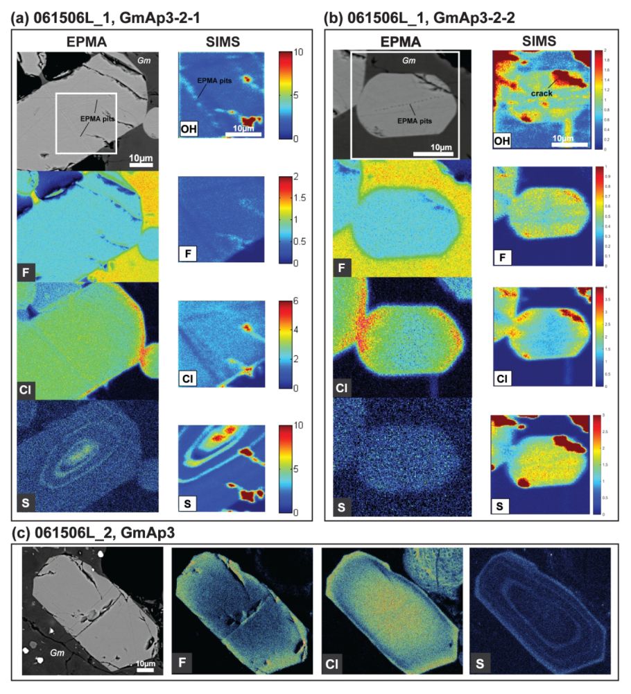 图5 印尼默拉皮火山2006年(a,b)和2010年 (c,d) 两次喷发形成的火山岩基质中的磷灰石晶体的挥发分成分。其中,2006年喷出的磷灰石晶体有氯元素环带,而2010年喷出的磷灰石没有显著环带(Li et al., 2020b)
