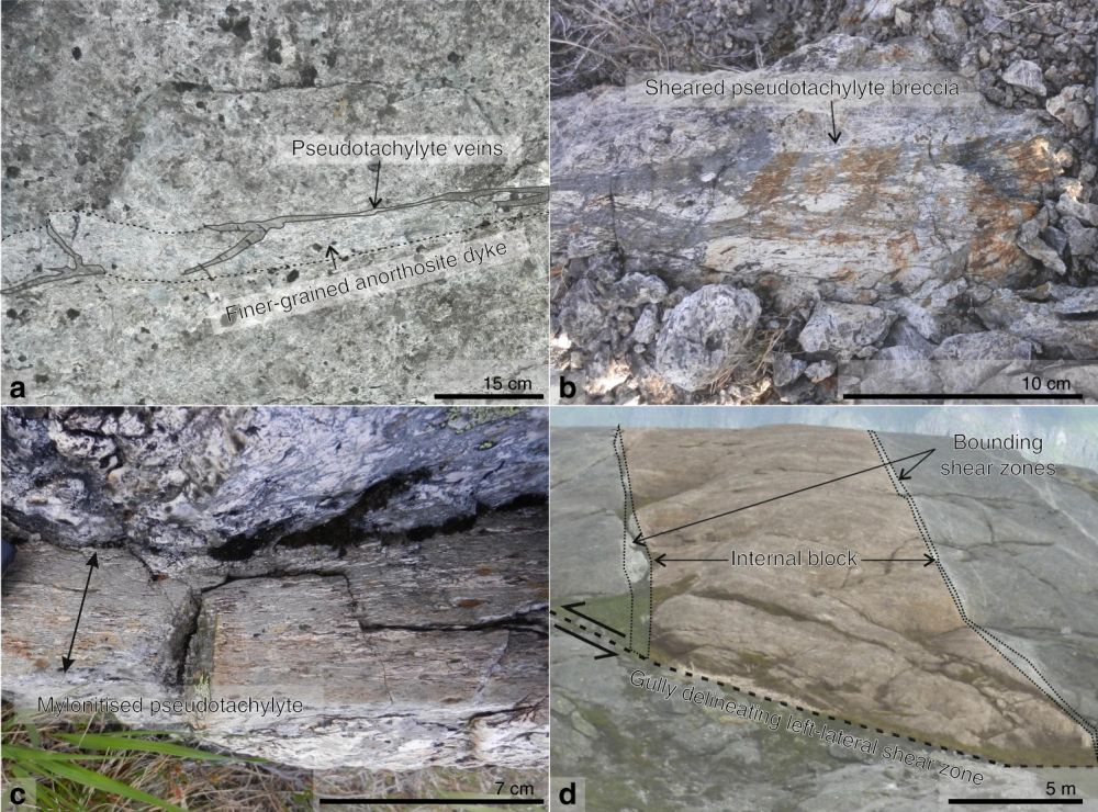 挪威的Lofoten-Vesteralen群岛是世界上为数不多、大面积出露大陆下地壳岩石的地区,为研究下地壳的地震构造提供了重要载体。研究人员首先对该地区进行了详细的构造填图分析,发现了多组剪切带均发育岩石快速滑动过程中摩擦生热熔融的产物——假玄武玻璃。按构造特征可将假玄武玻璃分为两类,强烈糜棱岩化(I类;图1)和未变形(II类;图2)。随后,通过对比I类和II类假玄武玻璃的构造关系以及围岩麻粒岩相的矿物组合,该团队认为两类假玄武玻璃均发生在下地壳层次,温压条件为650–750℃和0.7–0.8 GPa。其中II类因为未经历变形改造,因此被认为是同震产物。同时,结合对II类假玄武玻璃相关的同震破裂长度和位移距离统计,这些地震发生的同时产生了异乎寻常的大应力降(>1 Gpa)。