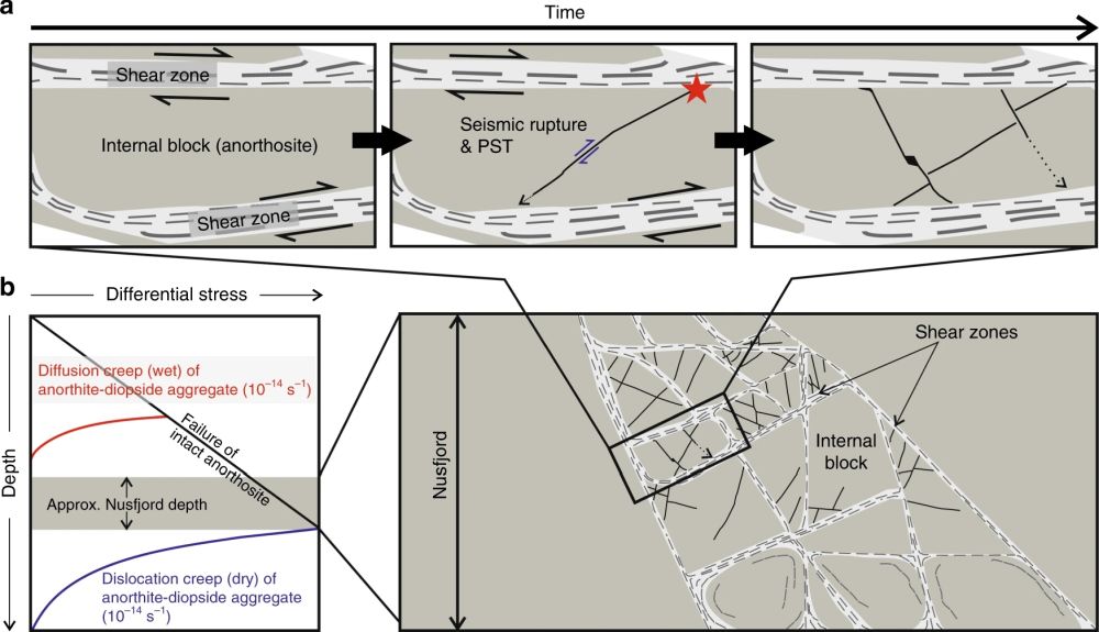 普利茅斯大学的L.R. Campbell等研究人员在Nature Communications发表研究论文,针对发生在刚性下地壳的陆内地震提出了一种新机制:地壳深处的岩石缓慢蠕变剪切,由于不同剪切带之间的相互作用,直到它们无法承受不断增大的差异应力并突然断裂,从而引发地震。