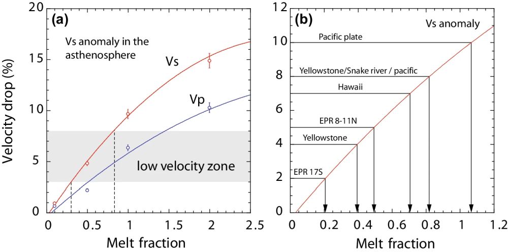 Debayle等研究还发现,在快速运动(大于4cm/year)的板块,如太平洋板块下部,软流圈100-200 km深度处的熔体含量也高。这表明,熔体促进了变形,而变形支持LVZ中熔体的滞留。少量熔体的存在可使构造板块下方地幔的粘滞系数降低1-2个量级,使板块与下伏地幔“解耦”。