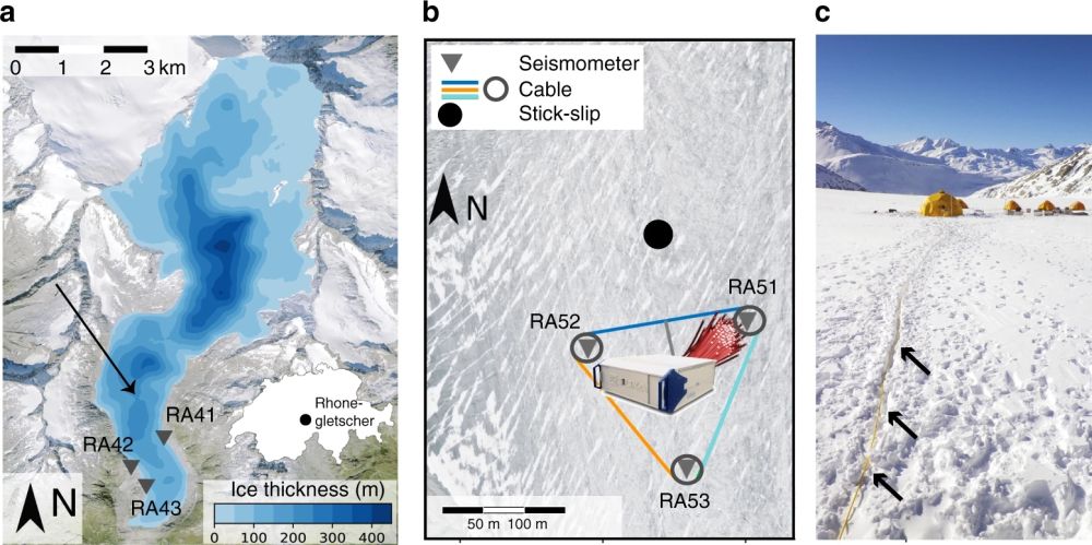 图1 罗纳格莱切观测点示意图。(a)冰川厚度分布,厚度数据来自探地雷达剖面(冰流由北向南),其中三角形表示基岩地震仪,黑色箭头指向图b的区域;(b)地震仪和光缆的布局;(c)雪地中的光缆照片(箭头)和野外营地(Walter et al., 2020)