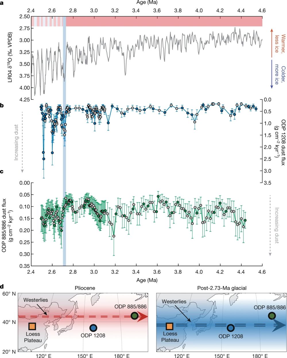 图1 上新世-更新世北太平洋粉尘通量重建记录(Abell et al., 2021)。a. LR04 δ18O;b. ODP 1208孔粉尘通量;c. ODP 885/886孔粉尘通量;d. 西风带位置示意图