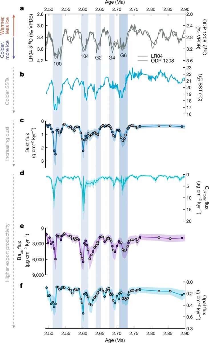 作者还分析了南部ODP1208孔的海表温度和海洋生产力变化,并与粉尘通量进行了对比。结果显示,海表温度(图3b)和海洋生产力(图3d-图3f)与粉尘通量具有相似的变化,即在2.73 Ma后冰期-间冰期的波动明显增大,暗示着西风带位置的摆动增强。