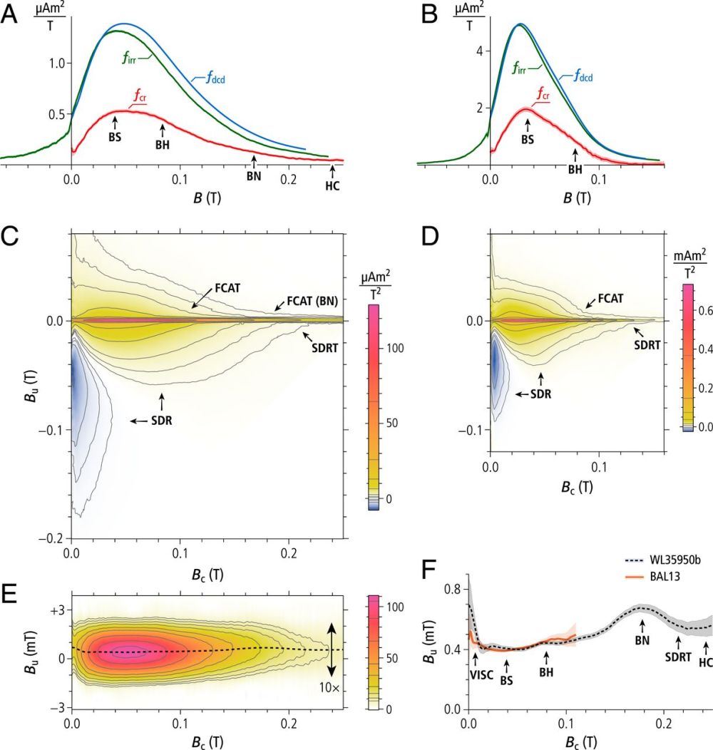 图1 样品WL35950b(A、C、E)和BAL13(B、D)的FORC图分析及其对比(F)(Wagner et al., 2021)