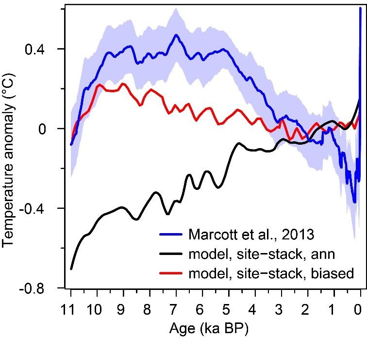 其次,作者进一步把SAT方法应用到40°S-40°N之间的海表温度重建(图3b)。结果显示,多数重建结果存在季节性偏差,且主要偏向于夏秋季,导致重建结果存在早中全新世大暖期(图3a、图3b);然而,校正后的年均温则显示,全新世呈持续升温趋势(图3b),与模拟结果基本一致(图3c);进而证实“全新世温度谜题”,可能主要源于气候代用指标的季节性偏差。